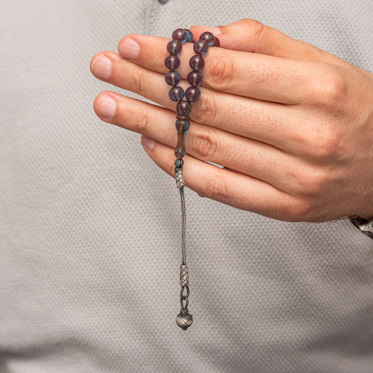 Gümüş Top Kazaz Püsküllü Şeffaf Mavi Sıkma Kehribar Tesbih