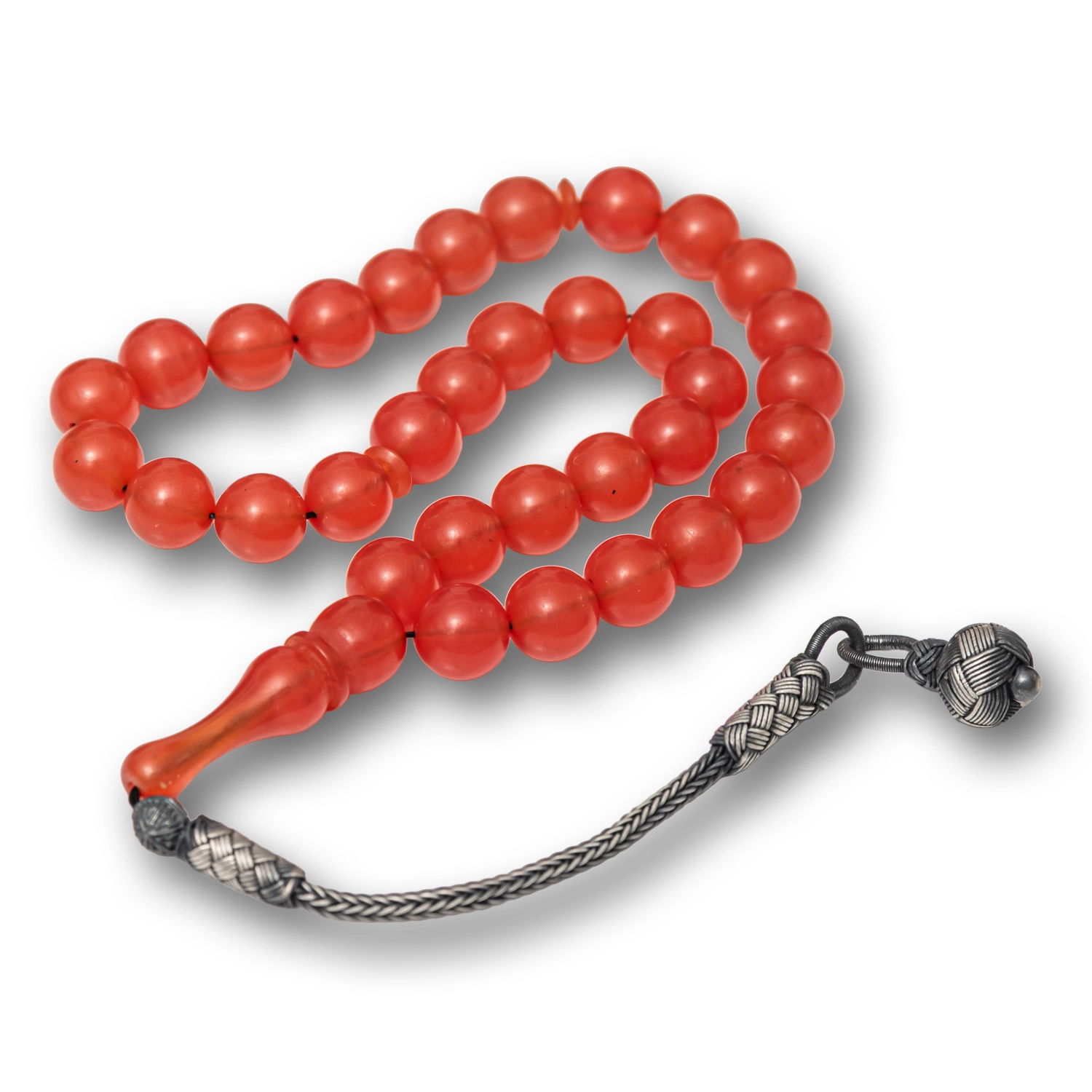 Gümüş Top Kazaz Püsküllü Yuvarlak Sıkma Kehribar Tesbih