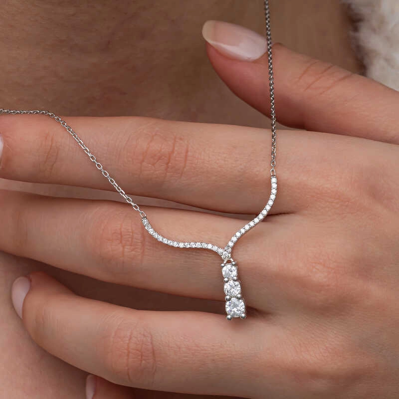 Üç taş, sevgi, dostluk ve sadakati simgeler.V modeli, bir denge ve güç sembolü olarak algılanabilir; bu da kişinin içsel gücünü ve dengede kalma arzusunu ifade eder.Bu şık kolye; doğum günü hediyesi, sevgililer günü veya özel günlerde tercih edilebilecek mükemmel bir seçenektir.Kolye; 925 ayar gümüşten imal edilmiştir. Gümüş üzerine rodyum kaplama yapılmıştır. Gümüş ve değerli taşlar nedeniyle belirtilen ortalama ürün ağırlığında ± %10 sapma olabilmektedir.