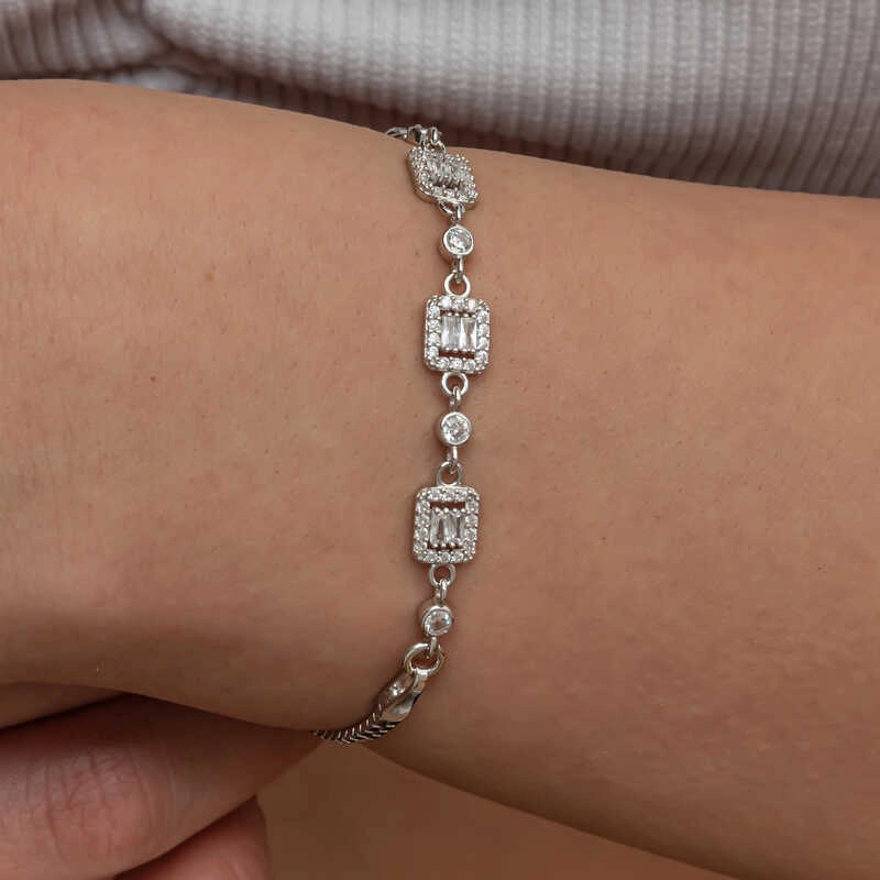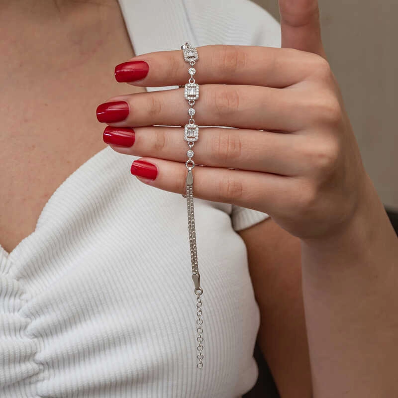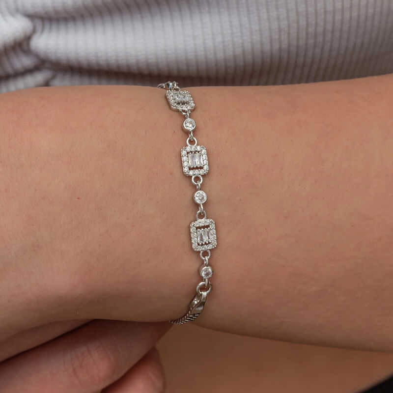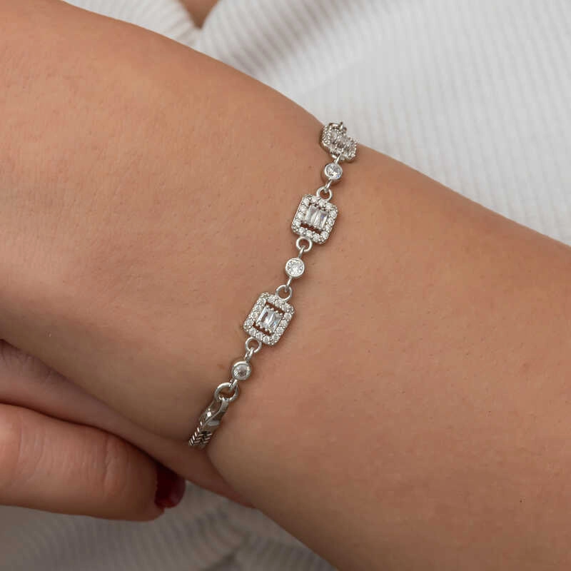 Üçlü baget taşlı kadın bileklik, şıklığı ve zarafeti bir araya getiren bir aksesuar türüdür.Bu bileklik, hem günlük kullanımda hem de özel günlerde rahatlıkla tercih edilebilecek bir aksesuardır. Farklı stillerle kombinlenebilir ve birçok kıyafetle uyum sağlar. Gümüş üzerine rodyum kaplama yapılmıştır. Rodyum kaplama yapılan zirkon taşlı kare kadın bileklik modelleri parlaklığını uzun süre muhafaza eder. Gümüş ve değerli taşlar nedeniyle belirtilen ortalama ürün ağırlığında ± %10 sapma olabilmektedir.