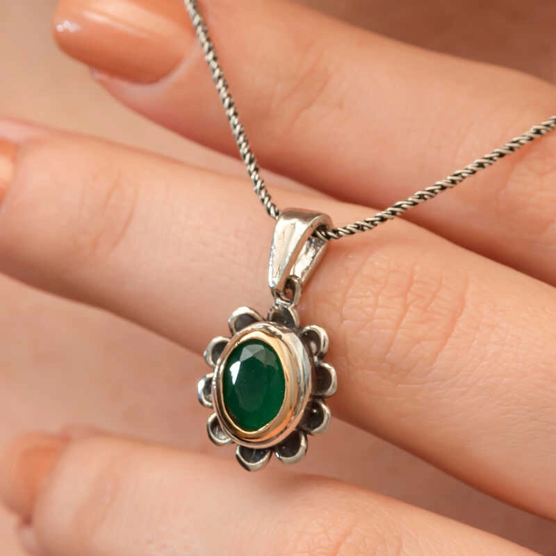 Yeşil taşlı otantik kolye geleneksel ve modern tarzları bir araya getirerek stilinize ikonik bir dokunuş katıyor.Hem bohem hem de klasik stillerle mükemmel bir uyum sağlar.Doğum günü hediyesi, sevgililer günü hediyesi veya annelere hediye olarak özel günlerde tercih edilebilecek mükemmel bir seçenektir.Gümüş yeşil çiçek desenli otantik kolye 925 ayar gümüşten imal edilmiştir. Gümüş üzerine rodyum kaplama yapılmıştır. Rodyum kaplama yapılan yeşil otantik kolye parlaklığını uzun süre muhafaza eder ve oksitlenmesi gecikir. Tüm kadın küpelerde olduğu gibi gümüş otantik kadın küpe de el emeği ile üretilmiştir. Gümüş ve değerli taşlar nedeniyle belirtilen ortalama ürün ağırlığında ± %10 sapma olabilmektedir.