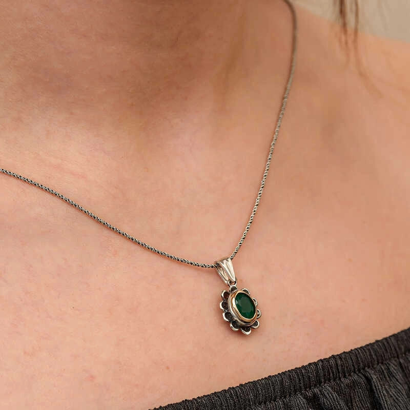 Gümüş Yeşil Çiçek Desenli Otantik Kadın Kolye