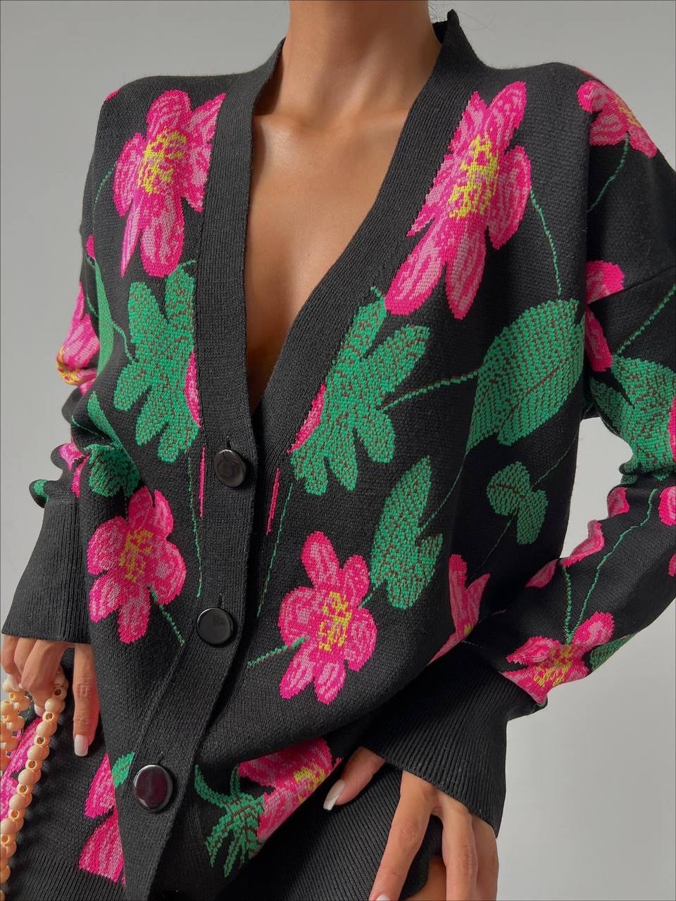 Kadın Çiçek Desen Oversize Triko Hırka