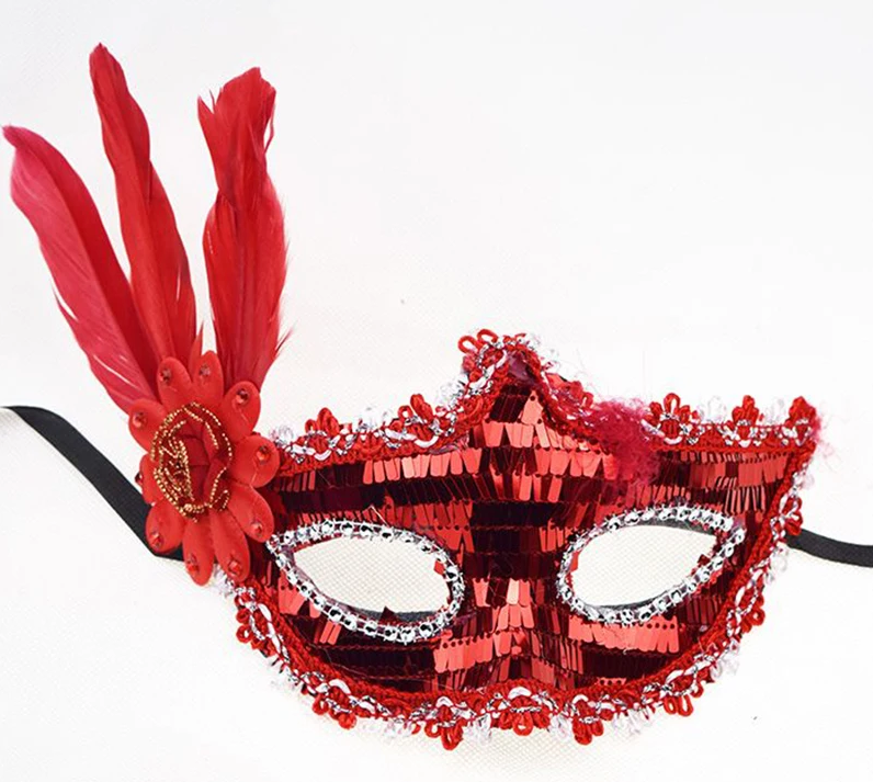 Kırmızı Payetli Pullu Tüylü Parti Maskesi