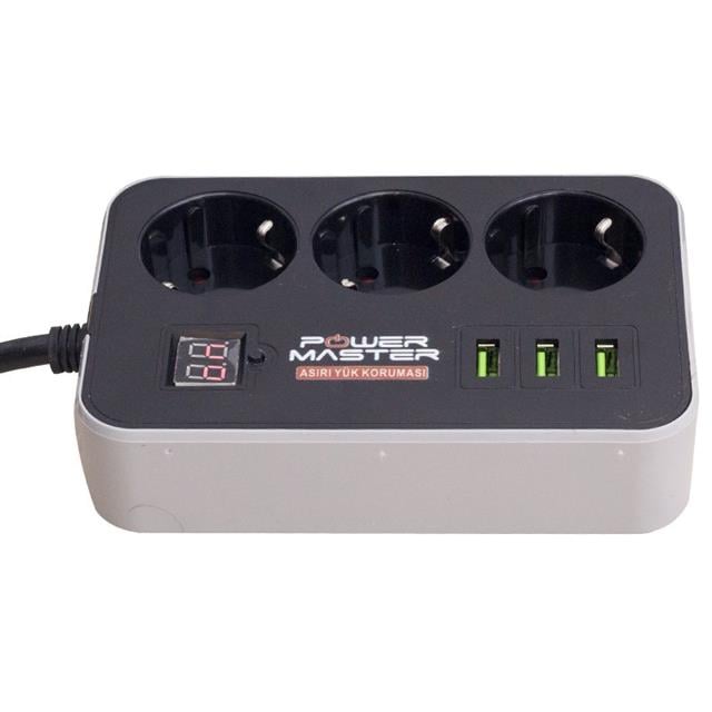 Powermaster 3 Usb Çıkışlı Dijital Ekranlı 10a-2500 W Siyah 1.8 Metre Kablolu 3'lü Akım Korumalı Priz Pm-18530