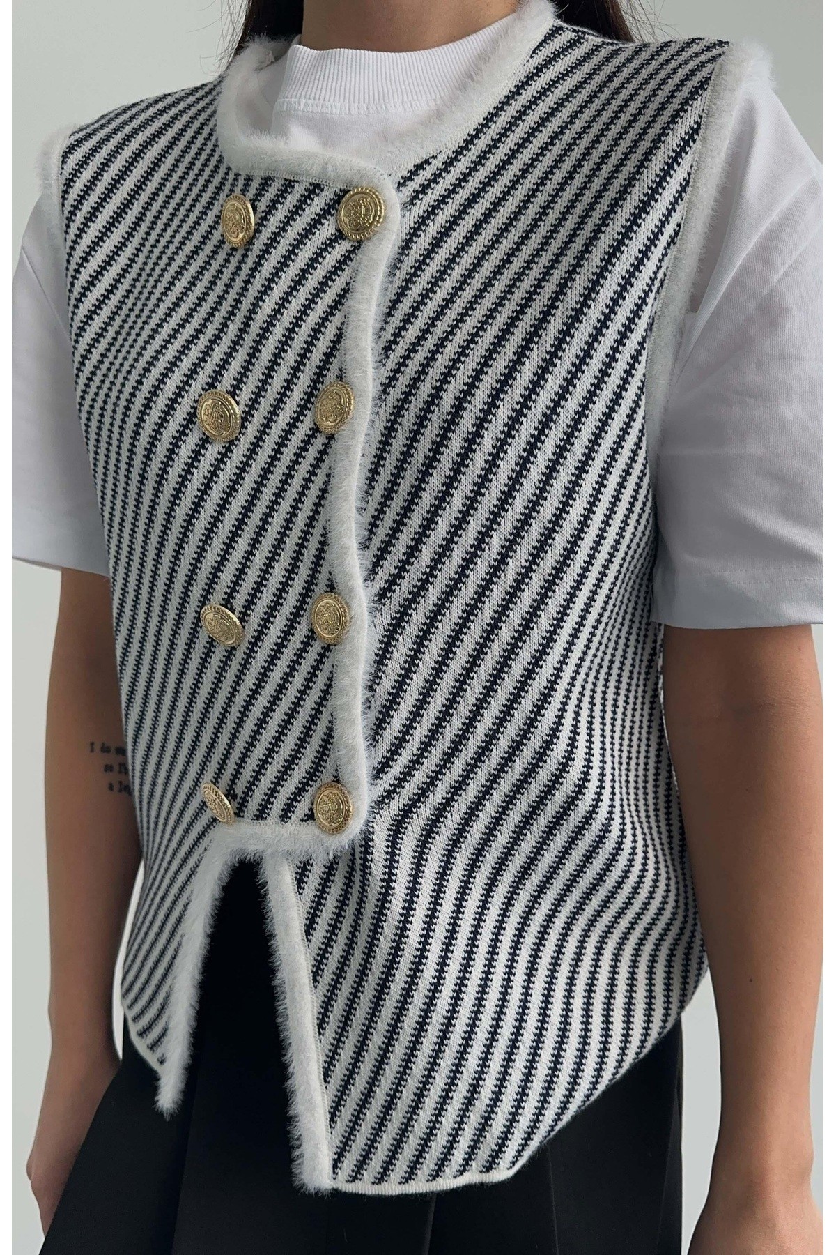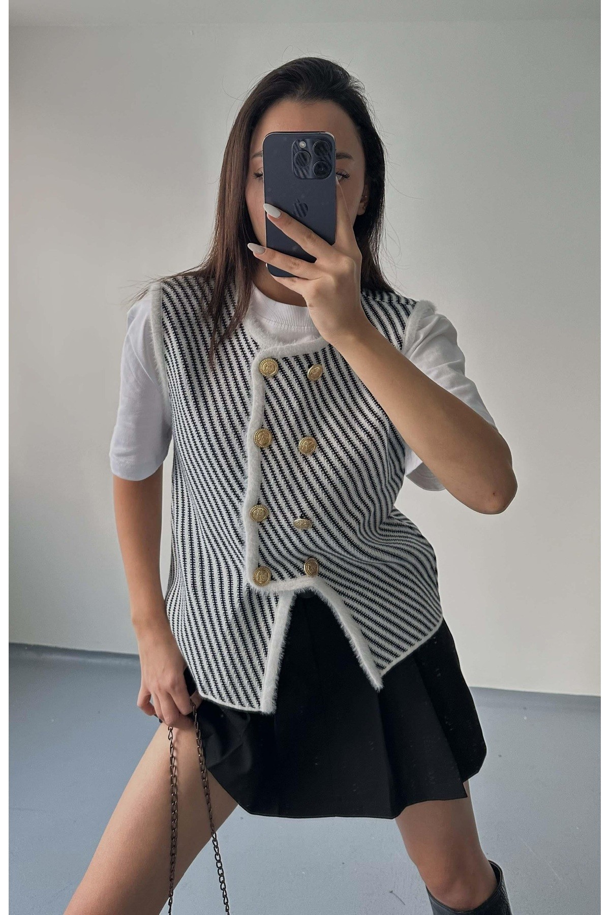 Yaka Detay Gold Düğme Asimetrik Kesim Triko Yelek