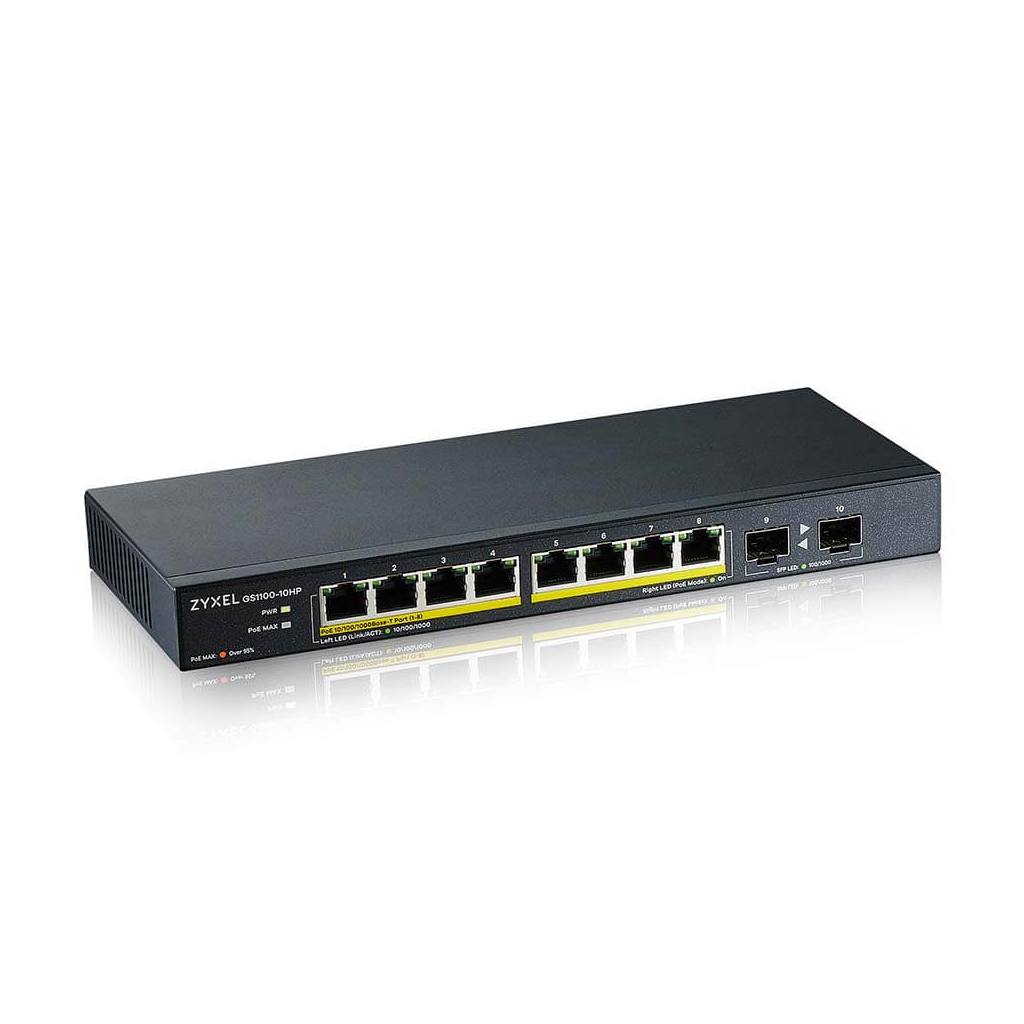 ZyXEL GS1100-10HP, 8 Port, Gigabit, PoE 130W, 2 Port GigaBit SFP, Yonetilemez, Masaustu Switch